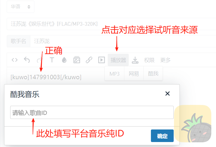 3、音乐试听,发布框上部“播放器”,将对应平台音乐ID填上直接确认即可!优先酷我音乐及网易云音乐ID(非VIP); (酷我)http://www.kuwo.cn/down/single/147991003 要数字ID(红色部分) (网易)https://music.163.com/#/song?id=2100666406 要数字ID(红色部分)