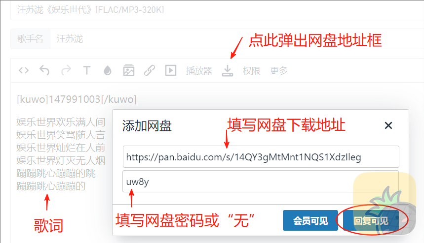 3、歌词,发布时请去除格式,纯文本按行粘贴即可,不需修改字体及字号;4、下载地址及密码,本站不支持上传本地,仅支持网盘发布,发布框上有下载按钮,对应填写网盘链接及提取码,点击“回复可见”