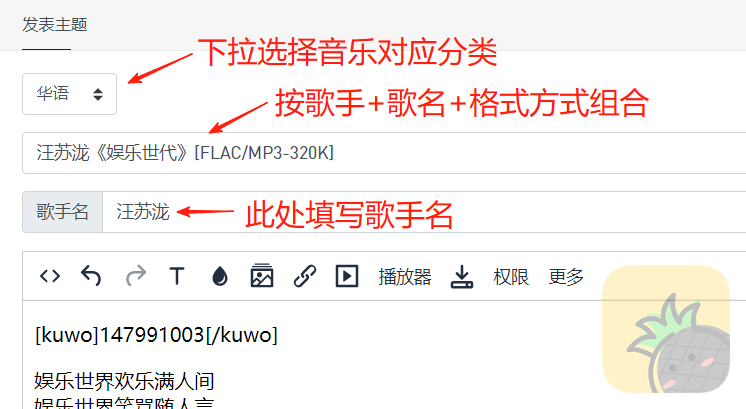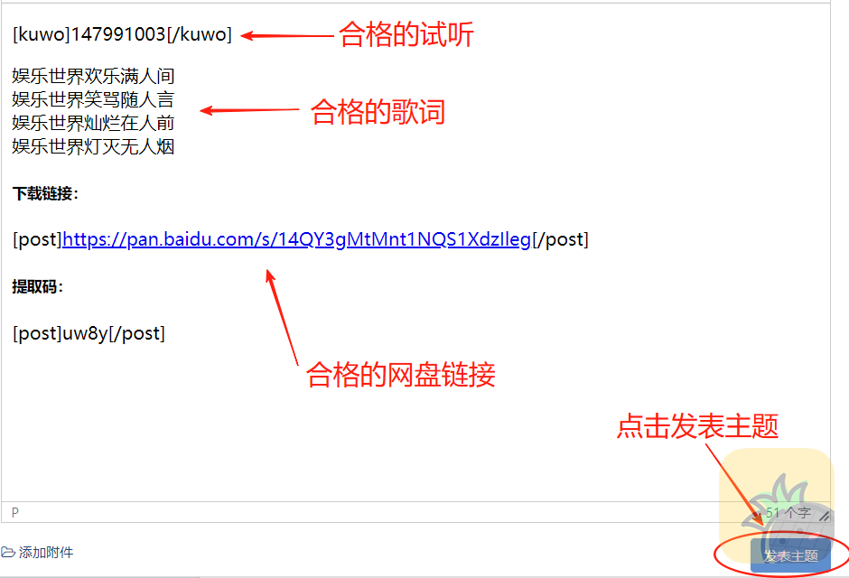 3、歌词,发布时请去除格式,纯文本按行粘贴即可,不需修改字体及字号;4、下载地址及密码,本站不支持上传本地,仅支持网盘发布,发布框上有下载按钮,对应填写网盘链接及提取码,点击“回复可见”